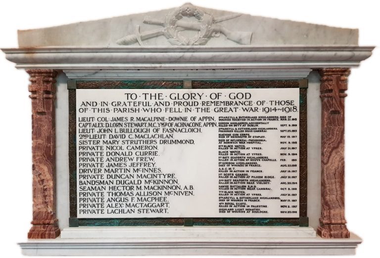 Fought with the 8th Argyll and Sutherland Highlanders. Died of wounds in France 17th May 1917, age 21. Parents, Donald and Mary MacPhee of Fasnacloich, Appin.